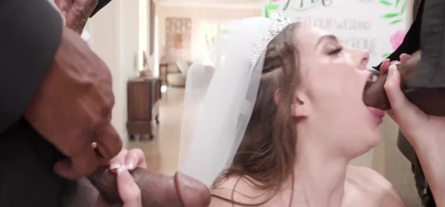 On her wedding night, the bride’s “gift” is a roomful of hung studs ready to fuck her every way.