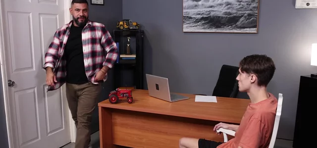 Daddy bear Nico Bear stretches his stepson Andy Adler’s ass bareback until he’s moaning from the deep, hard thrusts.