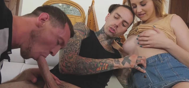Tatted hunk Ruckus dives into a bisexual threesome with Pierce Paris and a lucky girl, eating pussy and swapping cocks before blasting her with a hot, messy facial.