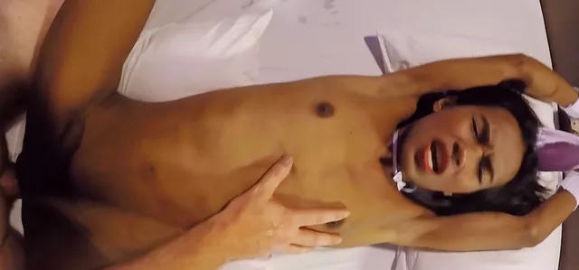 In her cute bunny look, this TS swallows a thick white cock, jerks it, and gets fucked deep until her own load spills. Amateur and gorgeous.