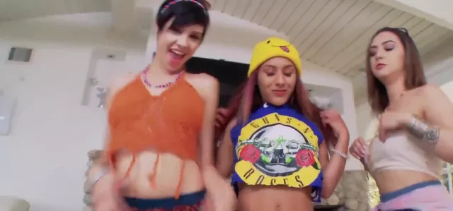 Three naughty gamer girls bounce hard on one very lucky cock, screaming with pleasure under rough pounding.