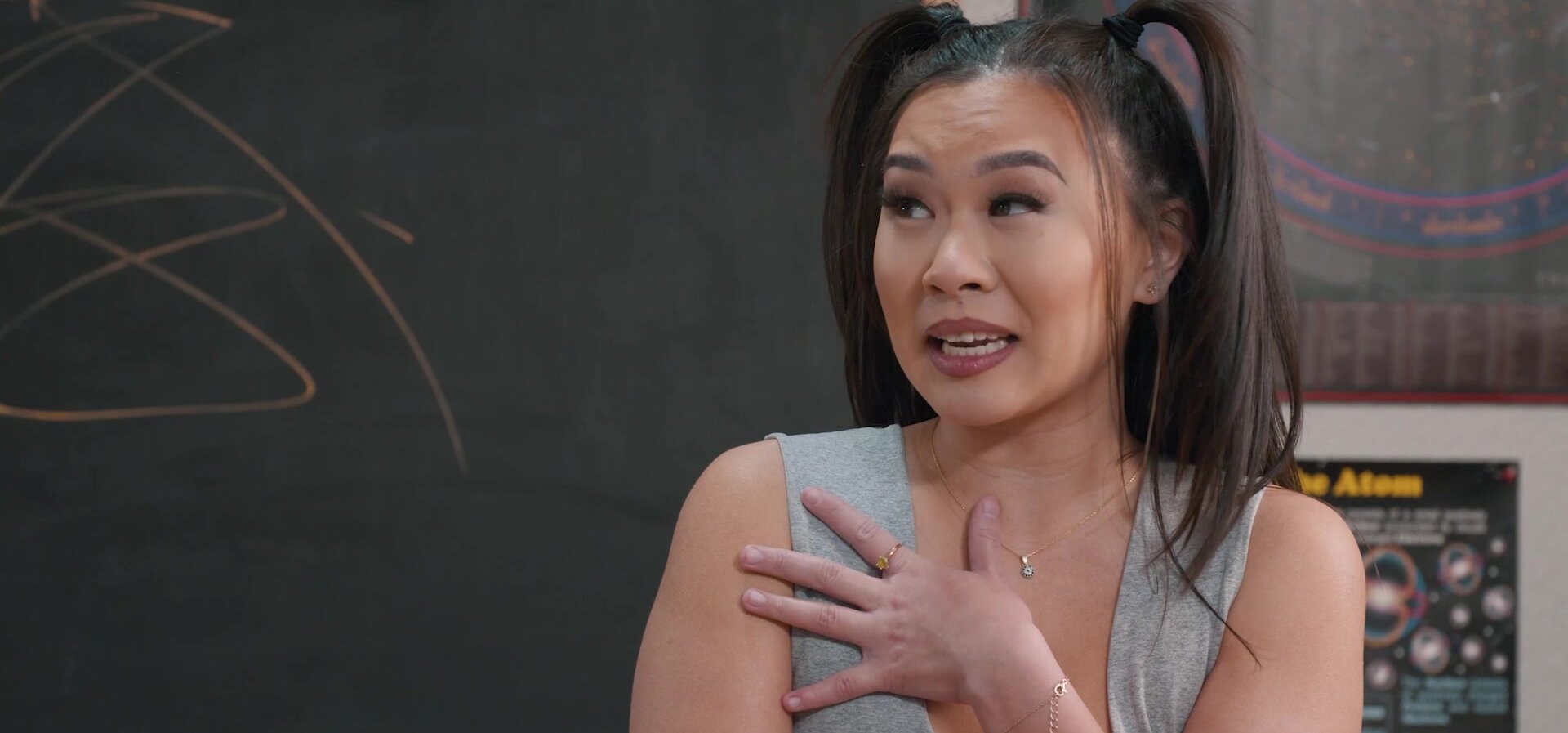 Kimmy Kimm gets caught masturbating and begs her hung teacher for mercy—deepthroating him before taking a hard, wet pounding.