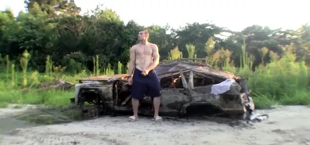 Handsome jock Elijah strips outside, tweaks his nipples, and pumps until he spills his load in the open air.