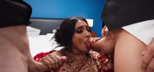 Skipping the honeymoon, Yasmina fucks two groomsmen — until her husband walks in and catches the sweaty mess.