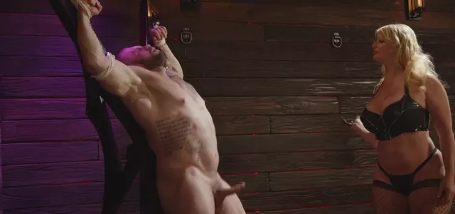 Buff sub takes cane, bites, and finally gets his hole destroyed by London’s huge strap-on. No cum for him, just aching submission.