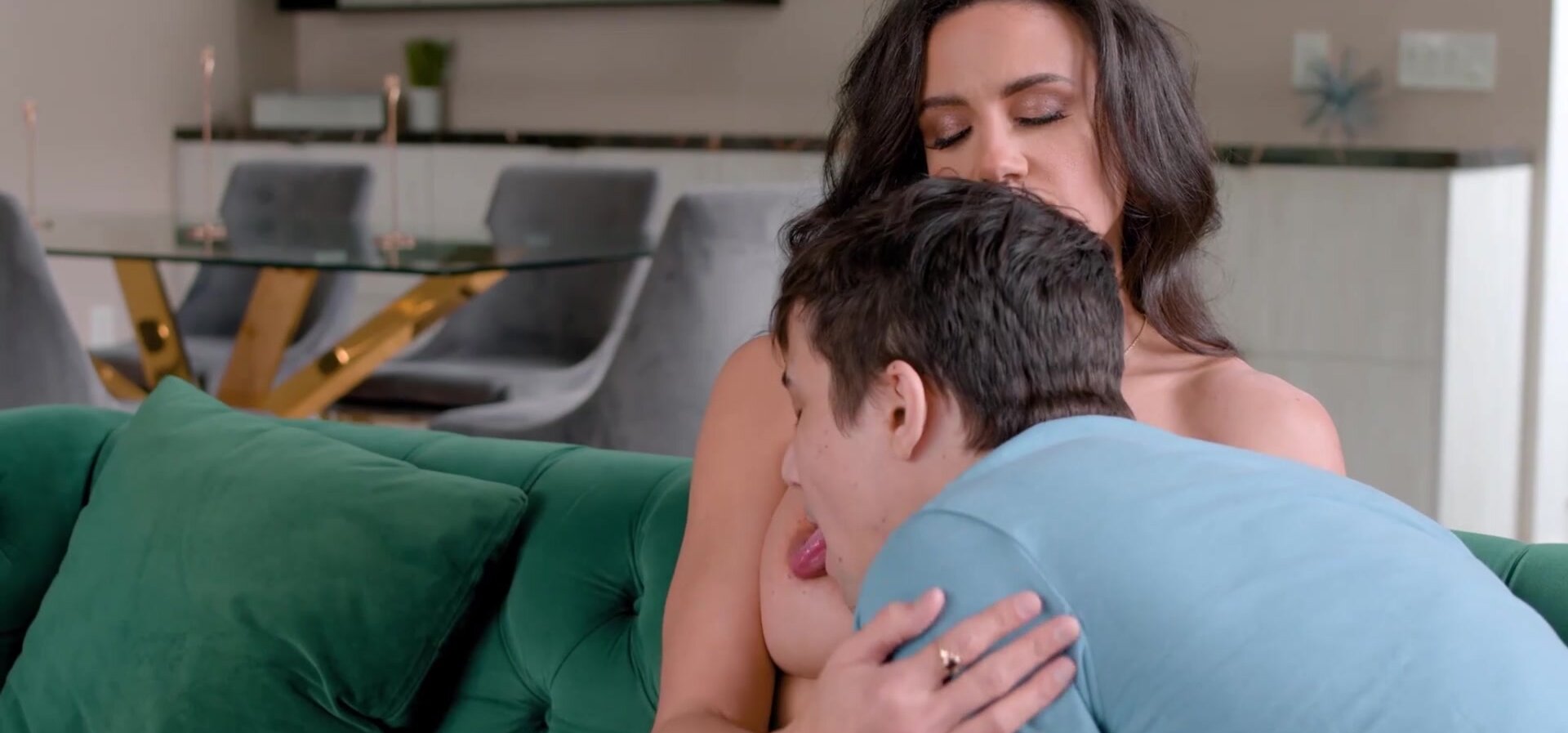 Penny’s patience runs out and she decides to teach her stepson sex herself. She rides him slow at first, then faster as he gets the hang of it. His first time ends with both of them panting.