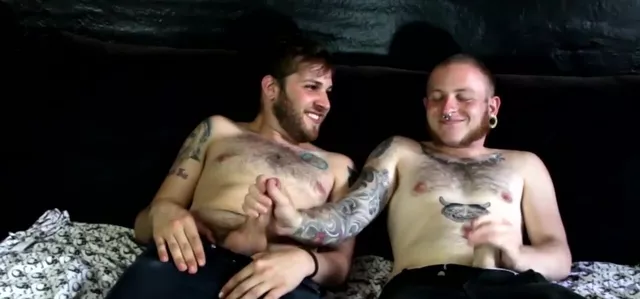 Two tattooed alt boys jerk side by side, then suck each other’s cocks sloppy and slow. Ink, spit, and orgasms all over.