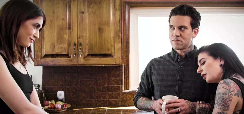 Big boobs tattooed MILF bride Joanna Angel found her evil stepsister Jane Wilde blowing her husband to be and joins in all angrily to suck his big dick off as well before the horny stepsisters compete to get pounded with that boner in a threesome!